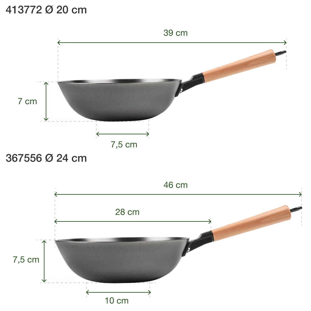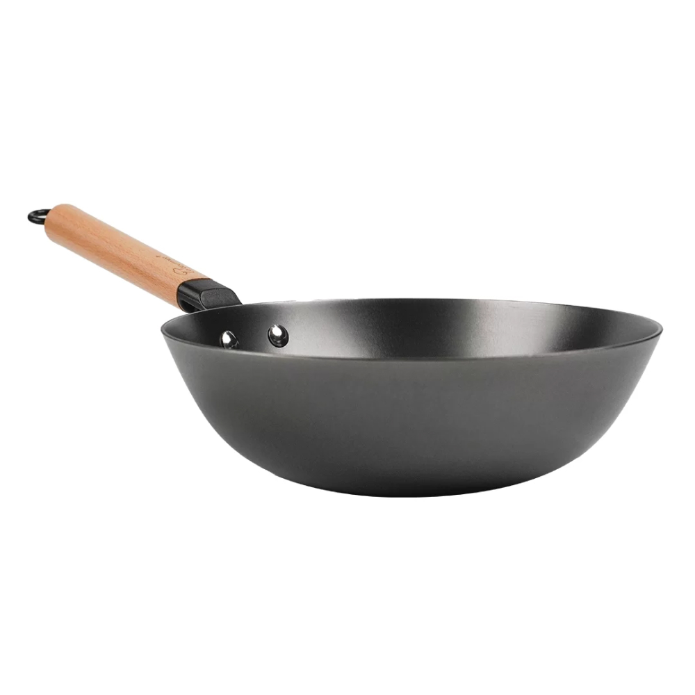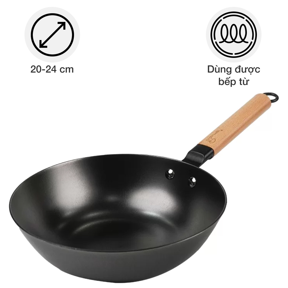 | Tiện ích | – Lớp chống dính tự nhiên an toàn (qua quá trình tôi dầu) – Truyền nhiệt cực tốt – Tạo hương vị món ăn chuẩn Wok Hei – Chống gỉ với công nghệ Nitrigan – Cán gỗ có thể tháo rời – Móc treo tiện lợi |