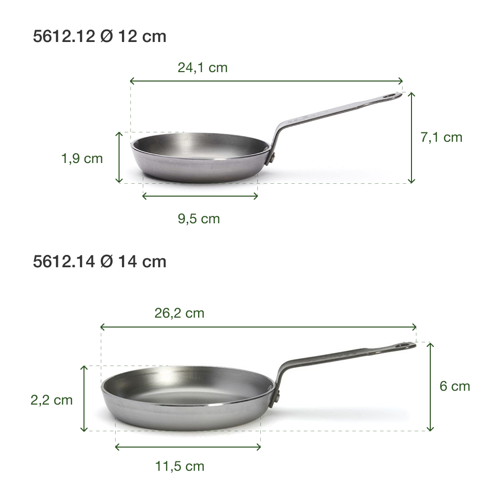 Kích thước – Khối lượng | – Chảo Ø 12 cm: Đường kính đáy 9,5 cm x Cao 7,1 cm x Rộng 12,2 cm x Dài 24,1 cm – Nặng 0,43 kg – Chảo Ø 14 cm: Đường kính đáy 11,5 cm x Cao 6 cm x Rộng 14,5 cm x Dài 26,2 cm – Nặng 0,51 kg |