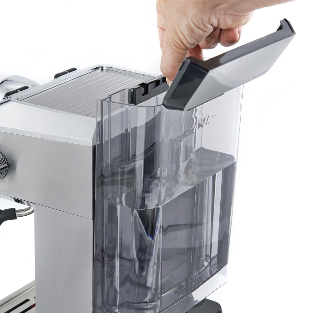 | Tiện ích | – Khay hứng nước bằng thép không gỉ có thể tháo rời, dễ dàng vệ sinh – Đồng hồ áp suất hiển thị áp suất pha chế thực tế – Vòi đánh sữa làm bằng thép không gỉ, phù hợp để pha latte, cappuccino, flat white,… – Khay hâm nóng cốc tích hợp giữ cho cốc cà phê ở nhiệt độ tối ưu – Tích hợp chân đế chống trượt |