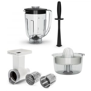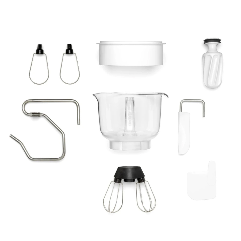 | Phụ kiện | – 1 bát trộn bột 7 lít – 1 bát đánh trứng 3,5 lít – 1 nắp đậy – 1 đầu nhồi bột – 1 cây lăn bột – 1 dao cắt bột – 1 trục truyền động – 2 que đánh trứng dạng lồng ballon – 2 que đánh trứng cookie – 1 dụng cụ vét bột |